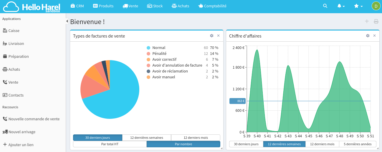 L'aide de chaque partie du logiciel figure dans la section du même nom : Achats, Vente, CRM...