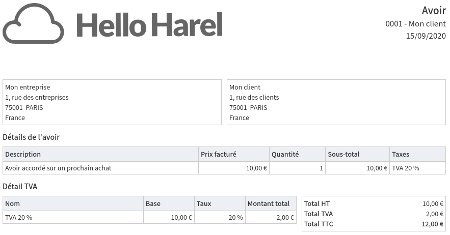 Le bouton Aperçu du pied-de-page vous permet de prévisualiser à quoi l'avoir ressemblera une fois émis. Le numéro de l'avoir est encore temporaire, et sera remplacé lors de son émission.
