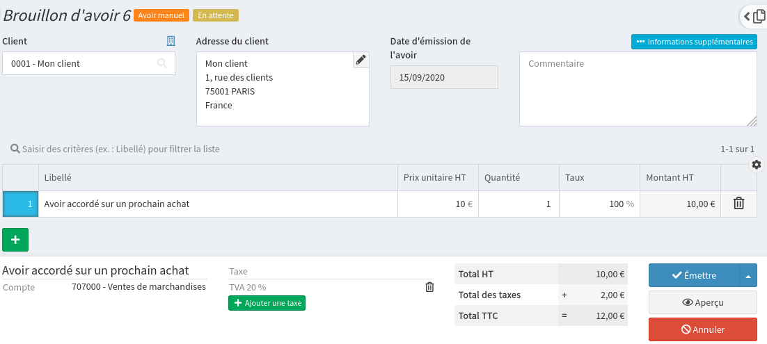 Un avoir manuel vous permet de créer librement un avoir, sans contraintes liées à une facture en particulier.