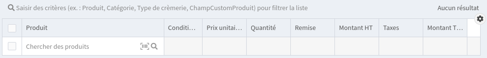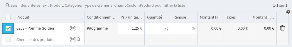 Saisissez votre produit dans la colonne Produit en commençant à taper son libellé ou son code.
