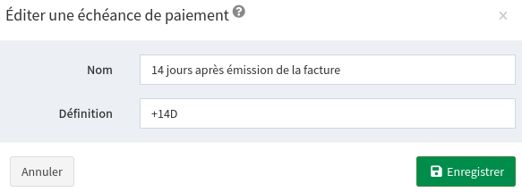 La Définition d'une échéance de paiement est la formule de calcul permettant d'obtenir une date d'échéance à partir de la date d'émission de la facture.
